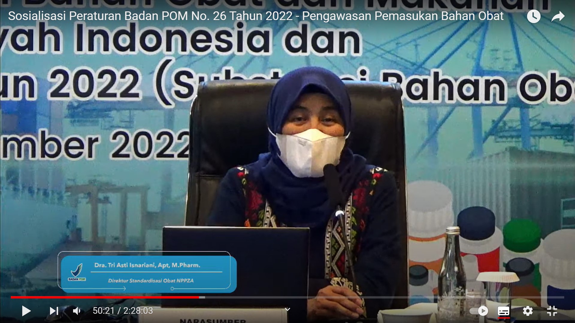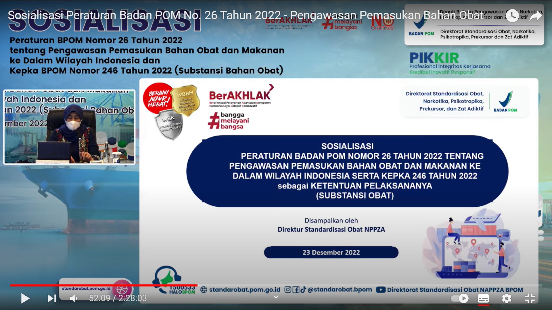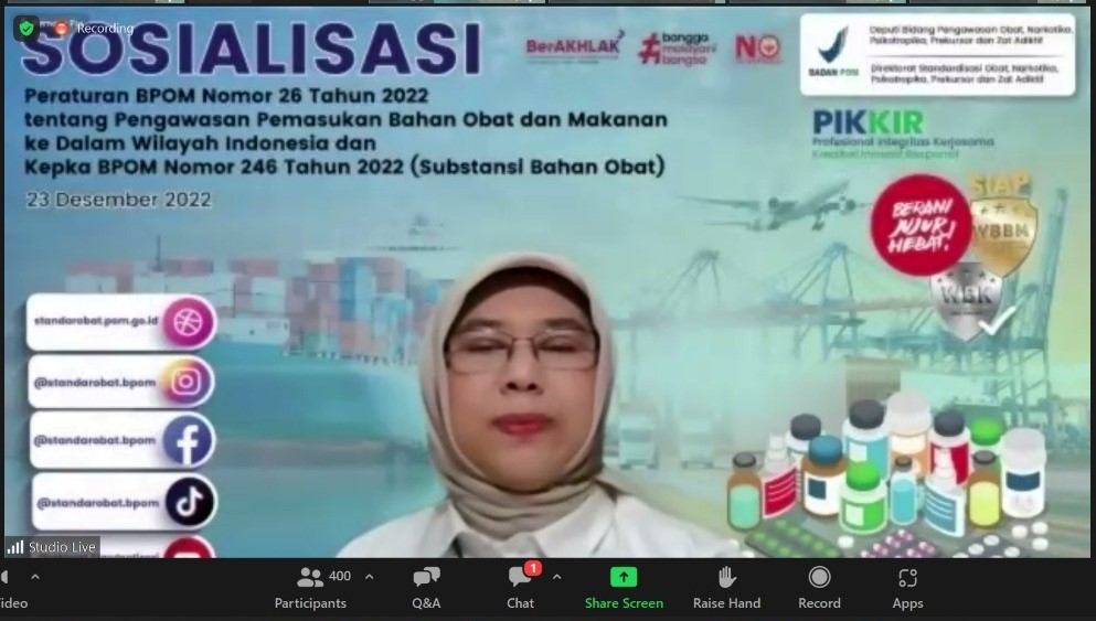 Sebagai upaya peningkatan pemahaman dan penyamaan persepsi stakeholder terhadap Peraturan Badan POM No. 26 Tahun 2022 tentang Pengawasan Pemasukan Bahan Obat dan Makanan ke Dalam Wilayah Indonesia dan ketentuan pelaksanaannya yaitu Keputusan Kepala Badan POM No. 246 Tahun 2022, Badan POM melalui Direktorat Standardisasi Obat, Narkotika, Psikotropika, Prekursor dan Zat Adiktif menyelenggarakan sosialisasi terhadap regulasi tersebut untuk substansi bahan obat pada tanggal 23 Desember 2022. Sosialisasi dilaksanakan secara hybrid, luring dari Ayana Midplaza Hotel, Jakarta, dan secara daring melalui aplikasi Zoom Webinar. Sosialisasi dihadiri oleh sekitar 500 peserta yang terdiri dari Kementerian/Lembaga terkait, antara lain Kementerian Koordinator Bidang Pembangunan Manusia dan Kebudayaan, Kementerian Koordinator Bidang Perekonomian, Kementerian Kesehatan, Kementerian Hukum dan HAM, Sekretariat Kabinet, Kementerian Perdagangan, Kementerian Perindustrian, Kementerian Keuangan, Badan Perlindungan Konsumen Nasional (BPKN), Yayasan Lembaga Konsumen Indonesia (YLKI); asosiasi pelaku usaha dan asosiasi profesi yaitu Gabungan Pengusaha Farmasi Indonesia (GPFI), International Pharmaceutical Manufacturer Group (IPMG), Ikatan Apoteker Indonesia (IAI), Ikatan Dokteri Indonesia (IDI), Ikatan Dokter Anak Indonesia (IDAI); serta internal Badan POM yang terdiri dari unit pusat dan Unit Pelaksana Teknis Badan POM di seluruh Indonesia. Dalam sambutan pembukanya, Plt. Deputi Bidang Pengawasan Obat NPPZA menyampaikan bahwa penyusunan Peraturan Badan POM No. 26 Tahun 2022 dilatarbelakangi dengan pemberlakuan Buku Tarif Kepabeanan Indonesia (BTKI) 2022 oleh Pemerintah dan terdapat kebutuhan peningkatan efektivitas pengawasan berkaitan dengan kasus cemaran Etilen Glikol (EG) dan Dietilen Glikol (DEG) dalam bahan baku obat yang dikaitkan dengan kasus Gangguan Ginjal Akut Progresif Atipikal (GGAPA) pada anak, sehingga perlu dilakukan penyesuaian terhadap regulasi sebelumnya yaitu Peraturan Badan POM No. 29 Tahun 2017 tentang Pengawasan Pemasukan Bahan Obat dan Makanan Ke Dalam Wilayah Indonesia sebagaimana telah diubah dengan Peraturan Badan POM Nomor 14 Tahun 2020. Pada kegiatan ini, Direktur Standardisasi Obat NPPZA dalam presentasinya menyampaikan beberapa highlight isi dari regulasi ini antara lain: