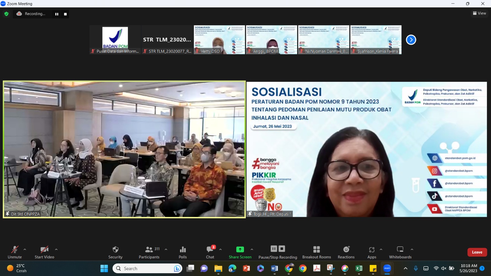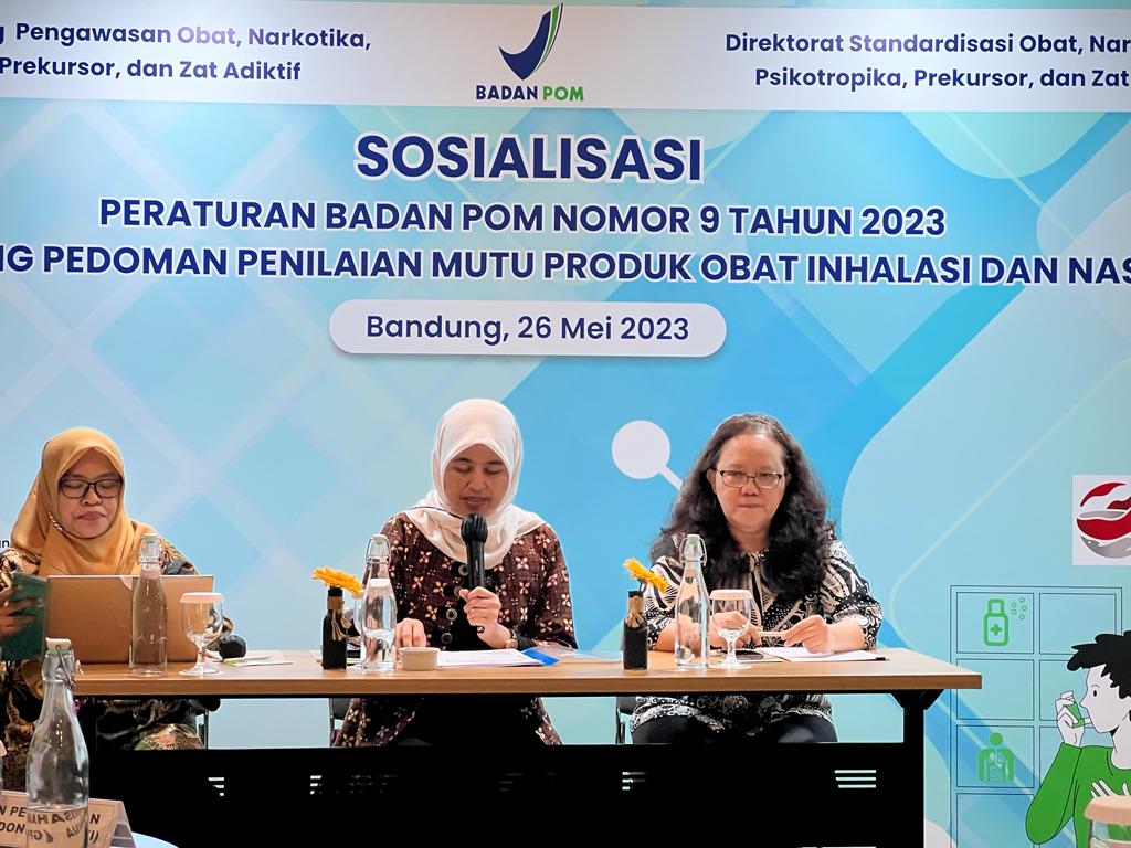 Bandung – Direktorat Standardisasi Obat, Narkotika, Psikotropika, Prekursor, dan Zat Adiktif telah melaksanakan kegiatan Sosialisasi Peraturan Badan POM Nomor 9 Tahun 2023 tentang Pedoman Penilaian Mutu Produk Obat Inhalasi dan Nasal di Kota Bandung, Jumat (26/05).
