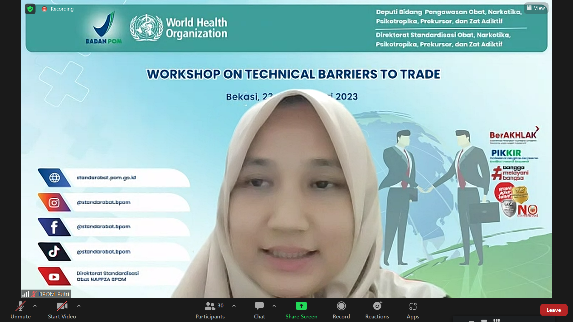 Sejak tahun 1995 Indonesia telah menjadi anggota WTO dan telah meratifikasi Perjanjian WTO melalui Undang-Undang Nomor 7 Tahun 1994 tentang Pengesahan Persetujuan Pembentukan Organisasi Perdagangan Dunia. Notifikasi ke WTO merupakan suatu kewajiban transparansi yang mewajibkan para anggota untuk melaporkan kepada badan WTO yang relevan apabila negara anggota melakukan tindakan perdagangan (trade measures) yang dapat berdampak kepada anggota lainnya. Pada tanggal 23-24 Februari 2023, Direktorat Standardisasi Obat, Narkotika, Psikotropika, Prekursor dan Zat Adiktif telah melaksanakan kegiatan Workshop on Technical Barriers to Trade yang merupakan salah satu bentuk kegiatan Joint Work Plan Biennium 2022-2023 antara Badan POM dengan WHO. Hadir secara luring dan daring sebanyak 68 peserta yang terdiri dari perwakilan staf Badan POM yang mempunyai tugas di bidang peraturan perundang-undangan, serta perwakilan dari WHO, BSN, Kementerian Perdagangan, dan Kementerian Luar Negeri. Workshop dibuka dengan sambutan dari perwakilan WHO Indonesia Country Office, Dr. Roderick Salenga serta arahan Plt. Deputi Bidang Pengawasan Obat NPPZA, Dra. Togi J. Hutadjulu, Apt., MHA. yang menyampaikan bahwa kegiatan ini dilaksanakan untuk memperluas pengetahuan mengenai Perjanjian TBT (TBT Agreement) dalam mendukung tugas pokok dan fungsi dalam penyusunan standar dan peraturan, meningkatkan pemahaman tentang persyaratan dan mekanisme atau prosedur notifikasi ke WTO, dan mengembangkan/meningkatkan kemampuan peserta untuk mengidentifikasi TBT. Workshop on Technical Barriers to Trade dilaksanakan dengan penyampaian materi-materi dan studi kasus oleh para narasumber. Sebagai pemateri pertama, Prof. Nurul Barizah, S.H., LL.M., Ph.D dari Center for International Trade Law Studies, Universitas Airlangga menyampaikan materi terkait kebijakan Non Tarif (Non-Tariff Measures) sebagai tindakan kebijakan yang merupakan instrumen perdagangan yang paling penting. Materi selanjutnya terkait Technical Barrier to Trade disampaikan oleh Bapak Vivianto Tampubolon dari Direktorat Perundingan Organisasi Perdagangan Dunia, Kementerian Perdagangan. Pada hari kedua, materi pertama disampaikan oleh Ibu Konny Sagala selaku Direktur Sistem Penerapan Standar dan Penilaian Kesesuaian, Badan Standardisasi Nasional terkait implementasi kewajiban internasional dalam Peraturan BSN Nomor 8 Tahun 2020, terutama notifikasi kebijakan/rancangan peraturan yang mempengaruhi perdagangan internasional. Dilanjutkan dengan penyampaian materi oleh Bapak Antonius Yudi Triantoro, Direktur Perdagangan, Perindustrian, Komoditas, dan Kekayaan Intelektual, Kementerian Luar Negeri terkait harmonisasi peraturan nasional dengan perjanjian TBT WTO. Sesi akhir disampaikan sharing pengalaman Badan POM dalam melakukan notifikasi ke WTO oleh Bapak Noorman Efendi selaku Kepala Biro Kerja Sama dan Hubungan Masyarakat, Badan POM. Dalam sambutan penutupnya, Plh. Direktur Standardisasi Obat, NPPZA, Dian Putri Anggraweni, S.Si., Apt. menyampaikan bahwa dengan workshop ini diharapkan peserta dapat mengimplementasikan pengetahuan dan pemahaman mengenai NTMs, khususnya TBT, dan dapat meningkatkan kualitas standar dan peraturan yang disusun. |