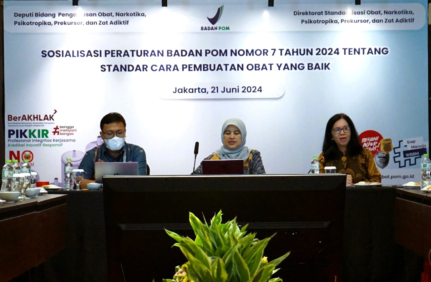 Jakarta - Badan POM melalui Direktorat Standardisasi Obat, Narkotika, Psikotropika, Prekursor dan Zat Adiktif telah melaksanakan kegiatan Sosialisasi Peraturan Badan POM Nomor 7 Tahun 2024 tentang Standar Cara Pembuatan Obat yang Baik pada tanggal 21 -